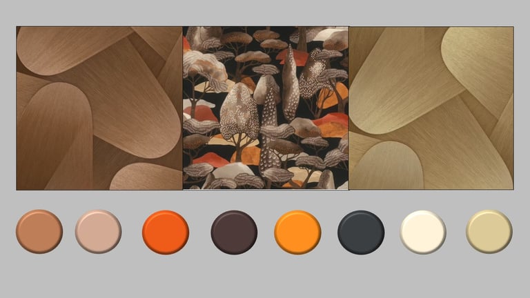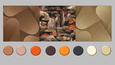 Papier peint (de gauche à droite) : Karmen cuivre 4 Murs, Sanary 4 Murs, Karmen mordoré 4 Murs. Peinture (de gauche à droite) : Papier d'Arménie Tollens, Intérieur Tollens, Mandarine RAL 2004 Dulux Valentine, Ebène Dulux Valentine, Safran 8 Dulux Valentine, Noir smoking velours Libéron, Limoncello 3 Dulux Valentine, Rêve épicé Dulux Valentine.