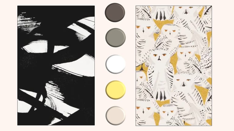 Papier peint (de gauche à droite) : York Designer series CC1301 enchevêtrement noir Wallpapertogo, Snowy Owls J.Marie Creates Happy wall. Peinture (de haut en bas) : Taupe fumé Benjamin Moore, Epave Colibri biosourcée, Blanc vrai Colibri biosourcée, Jaune Poussin Tollens, Gordy Colibri biosourcée, Blanc.