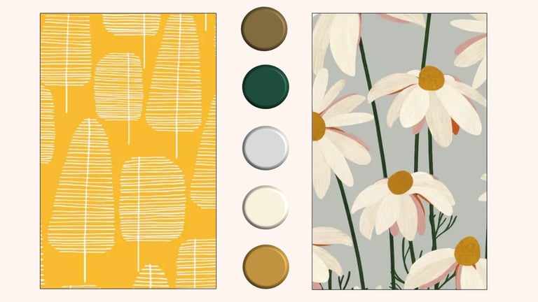 Papier peint (de gauche à droite) : Mid Century Forest yellow Mahe's Art Shop Happy wall, Daisies Pattern El Buen Limon Happy wall. Peinture (de haut en bas) : Coteau Colibri biosourcée, Vert basque RAL 6005 Dulux Valentine, Le Gris Clair Dulux Valentine, Lin Clair Dulux Valentine, Golden Kiwi CR414866 Tollens.
