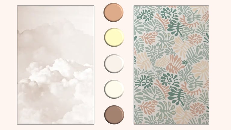 Papier peint (de gauche à droite) : Dreamy clouds 3 Anita's & Bella's Happy wall, Matisse leaves pattern modern minimalistic pastel soft colors Design d'Annick Happy wall. Peinture (de haut en bas) : Bonne mine Tollens, Anis 4 Dulux Valentine, Colombe Tollens, Jasmin Tollens, Pirogue Tollens.