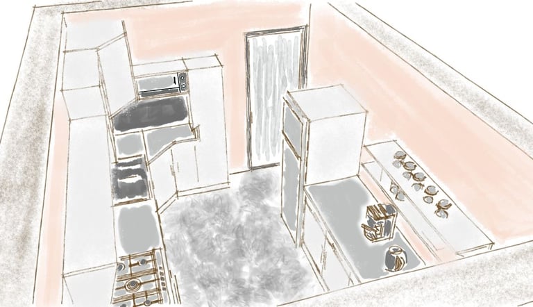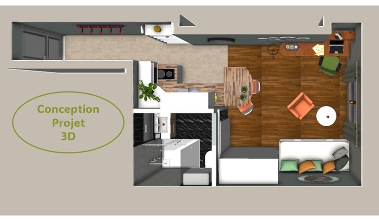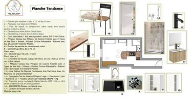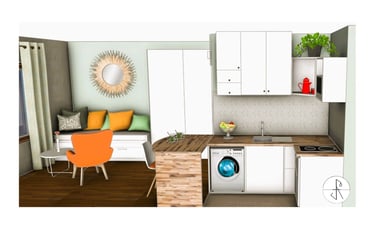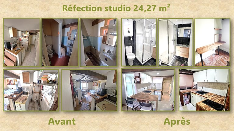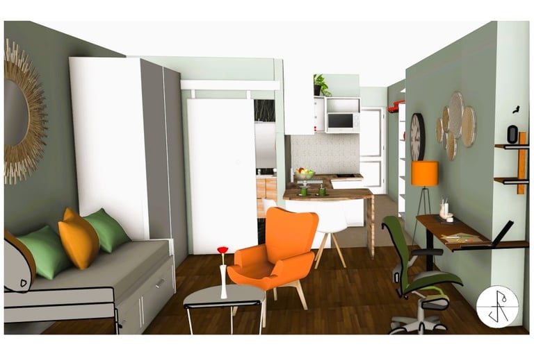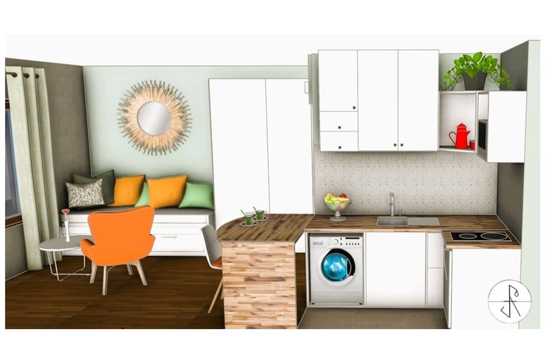 Refaire une kitchenette en aménageant un coin repas, recarreler le sol depuis l'entrée, faire une réfection du parquet dans la pièce à vivre, refaire également tous les murs. Il faut aussi prévoir un espace bureau car le logement est prévu pour un étudiant.