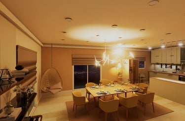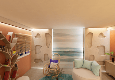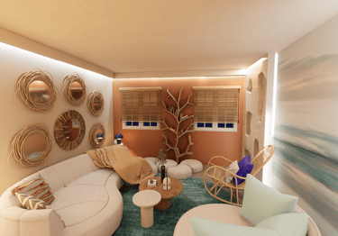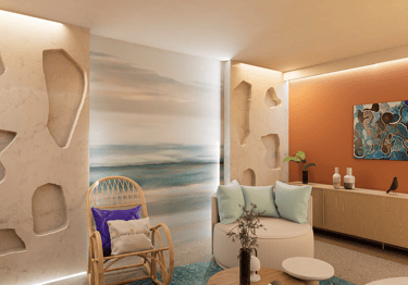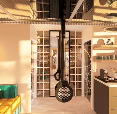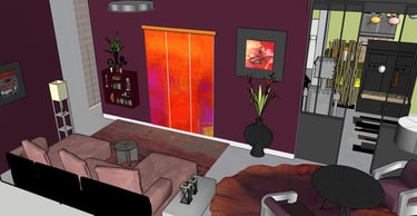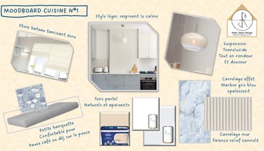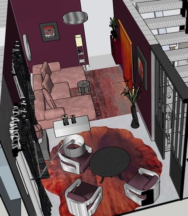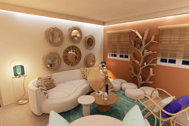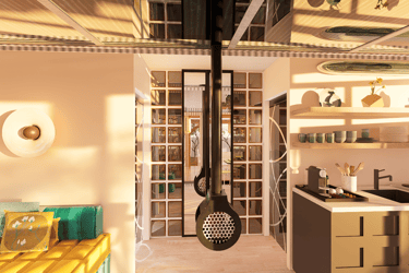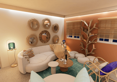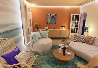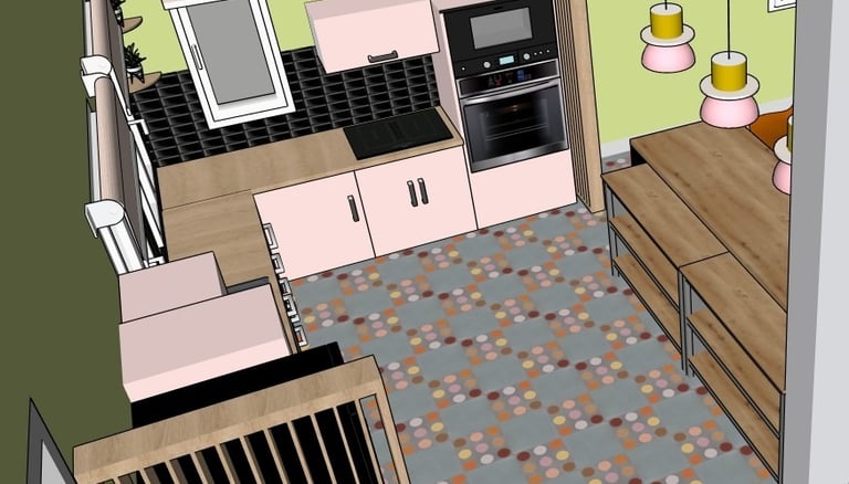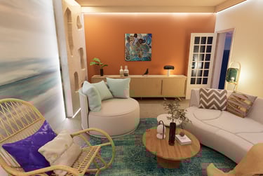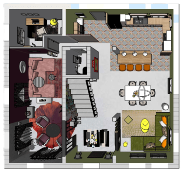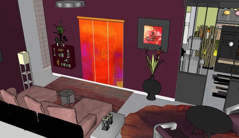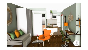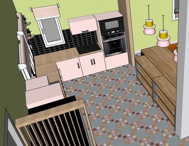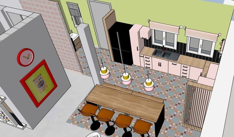 Nous suggérons des couleurs franchement vitaminées dans la partie Est pour les pièces d'activités telles que la cuisine, la salle à manger et le coin salon qui la prolonge. Les couleurs acidulées qui donnent un petit air des années Pop collent bien avec le profil des propriétaires. Dans la partie opposée la zone Ouest, celle qui abrite désormais un double séjour l'ambiance se veut plus cosy et profonde, propice à la détente et à des activités plus calmes.
