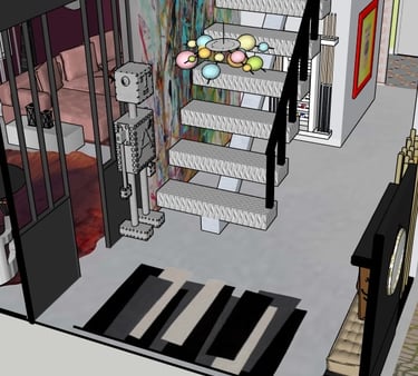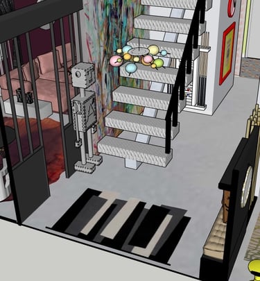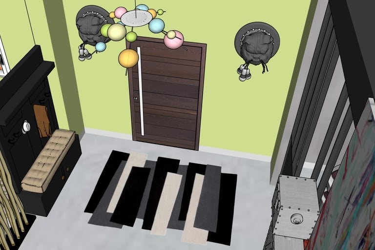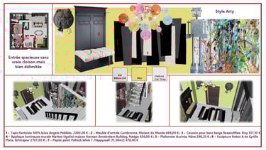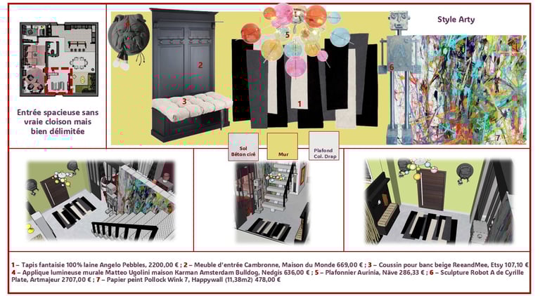 L'entrée donne le ton de l'originalité appréciée des occupants. Le lustre central en boule de verre multicolores répond au mur de la montée d'escalier sur lequel figure un papier peint artistique de style dripping à la Jackson Pollock. Au bas de l'escalier une grande sculpture robotique de taille humaine en métal de l'artiste Cyrille Plate appuie l'effet industriel et fait le lien entre l'escalier métallique d'usine et la séparation coulissante de type verrière. La zone de l'entrée se sépare du coin salon qui jouxte la salle à manger par un haut vestiaire avec banquette intégrée et un lampadaire paravent servant de brise-vue afin de préserver une certaine intimité. Le sol en béton ciré se réchauffe avec un grand tapis moderne au centre de la zone. Pour compléter, deux appliques lumineuses à tête de bouledogue tels des Cerbères encadrent la porte d'entrée.