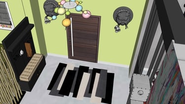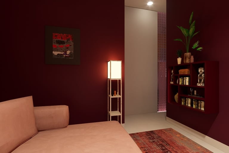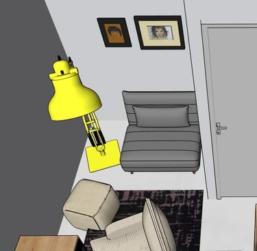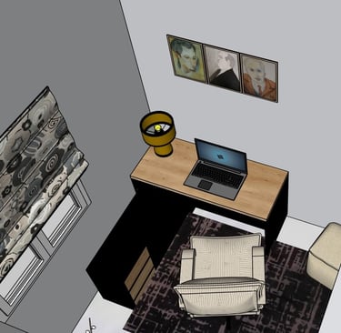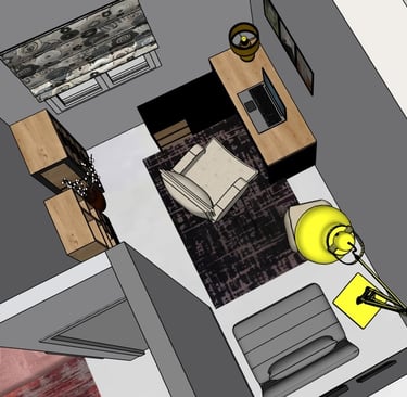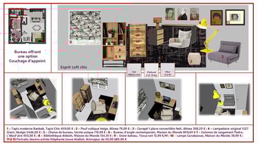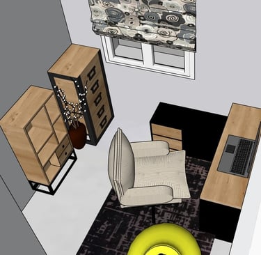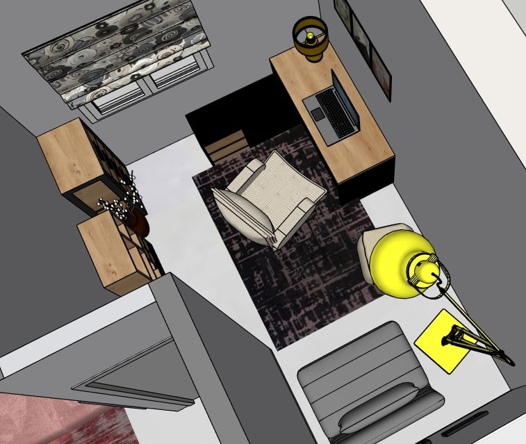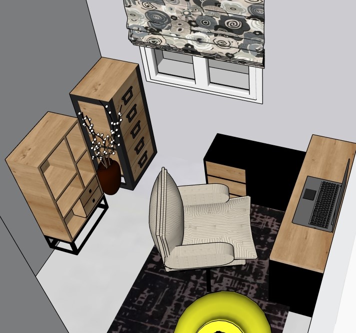 Le bureau est installé face à la fenêtre pour une luminosité optimale, un satellite sur roulettes vient le compléter. Un confortable canapé convertible en double couchage pour héberger les amis de passage ainsi qu'une armoire penderie d'angle sur mesure pour leurs affaires. L'ensemble est complété par une bibliothèque sur le mur face à la fenêtre et une télévision qui fait face au canapé. L'effet cosy et chaleureux est renforcé par les coussins, les éclairages prévus pour chaque fonction ou moment et un bon tapis moelleux.