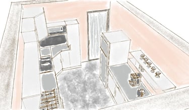 Les attendus du client sont d'ouvrir la cuisine et intégrer un grand îlot central, garder le cellier bien pratique, avoir un vrai hall d'entrée, supprimer une des chambres pour créer une suite parentale avec un dressing et une salle de bain supplémentaire et enfin garder le bureau qui servirait de chambre d'amis.