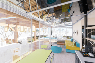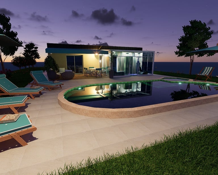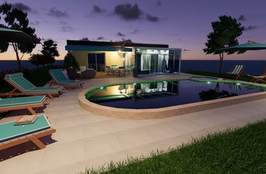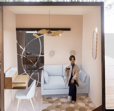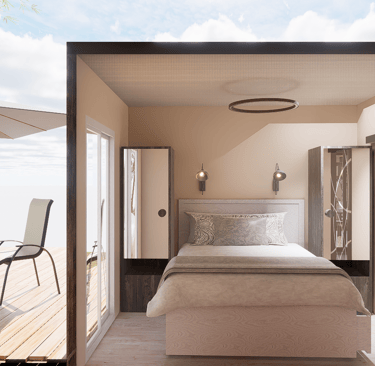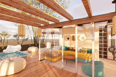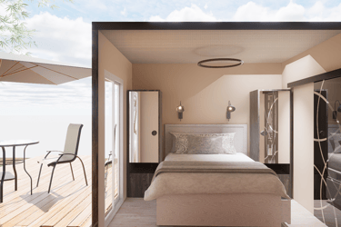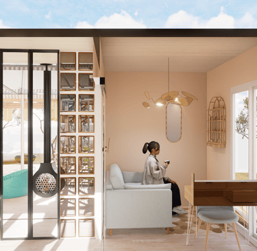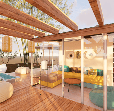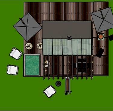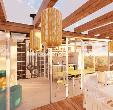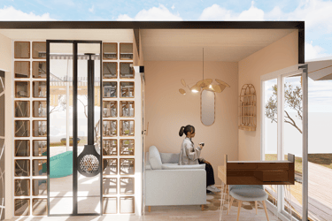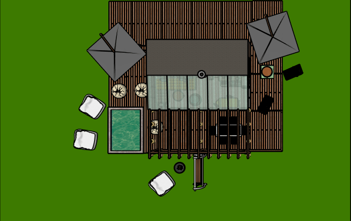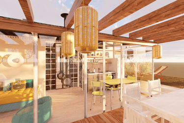 A la base l'objectif est de concevoir un projet rapide et facile à mettre en œuvre pour une petite résidence secondaire zen. Cette maisonnette à été pensée pour offrir de vrais moments de détente où chacun peut trouver sa place dans une surface très compacte. Chaque pièce de la maison est connectée avec l'extérieur pour laisser entrer la lumière et profiter au maximum du spectacle de la nature. Les panneaux coulissants de la véranda assurent une bonne aération et une fluidité de circulation vers la terrasse et l'extérieur donnant l'impression de vivre dedans-dehors. L'espace ainsi est agrandi et gagne de la perspective.