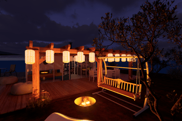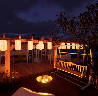 Ambiance petit feu et balancelle dans le jardin à la nuit tombée