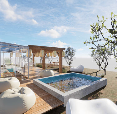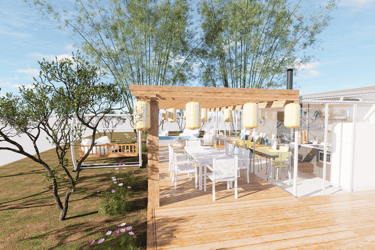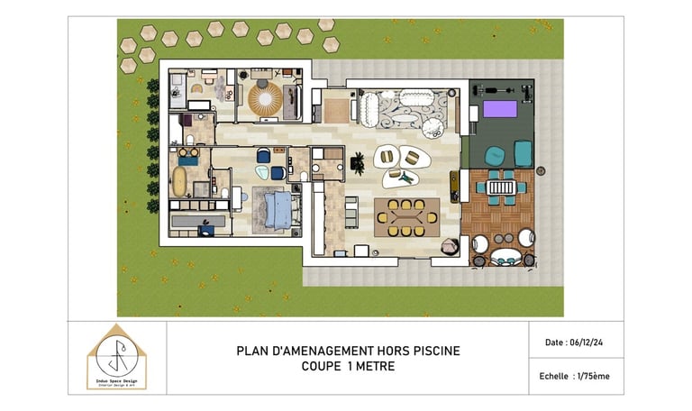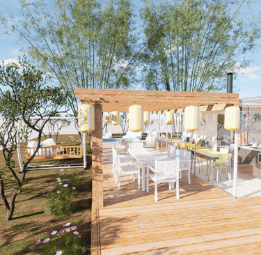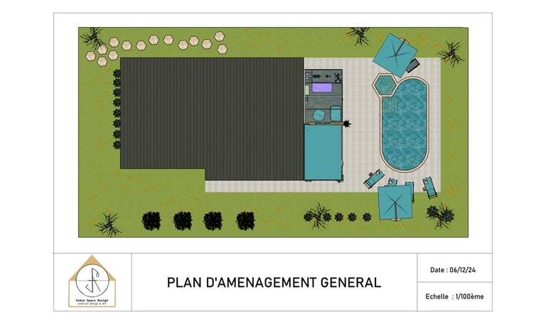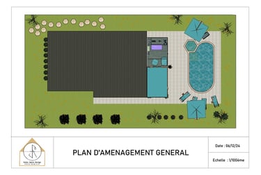 Ajout d'aménagement extérieur autour de la piscine et création d'une terrasse en bois abritée par un store déroulant où l'on a organisé une zone repas pour six personnes ainsi qu'un petit salon de jardin.