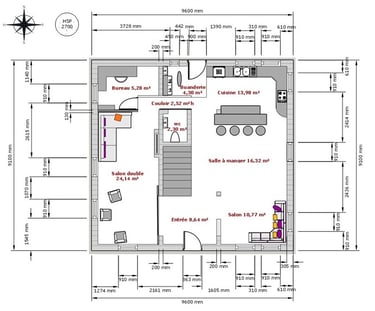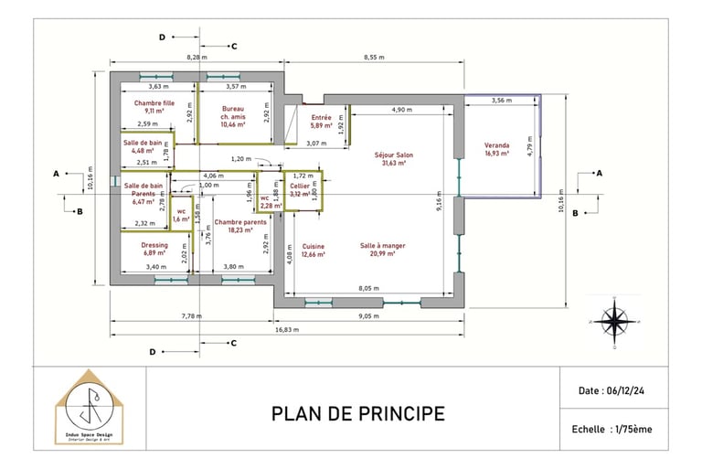 Présentation finale du nouvel agencement de la maison. Création d'un hall d'entrée pour l'accueil, cuisine décloisonnée avec îlot central plus cellier comme demandé. Une suite parentale complète avec salle de bains et dressing, une chambre d'enfant et un bureau / chambre d'amis, une seconde salle de bains, toutes les demandes du client ont été respectées.