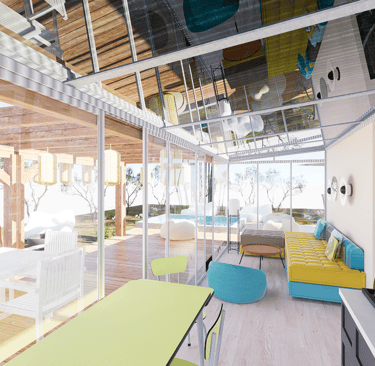 Posée sur une terrasse en bois de 153 m², cette petite maison de week-end offre une surface de 32 m² et fait la part belle à la détente avec un séjour ouvert sur une cuisine et coin repas dans un espace dédié de 17,77 m² abrité dans la véranda. La zone plus privative constituée d'une chambre double et d'un bureau / chambre d'amis se loge dans le côté container de la maison. La salle de bain s'insère au centre séparant les 2 pièces. La piscine d'une largeur de 2,50 mètres sur 3 mètres est aussi minimaliste que la maison. Pour des raisons écologiques de préservation des ressources, le bassin a été conçu pour pratiquer la nage statique (avec élastique). Un petit bassin est moins gourmand en eau, plus facile à chauffer et d'entretien. Quelques équipements d'extérieurs finissent d'aménager des petits coins de détente pour chaque moment de la journée.