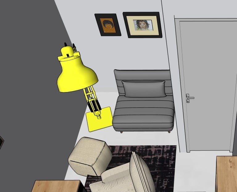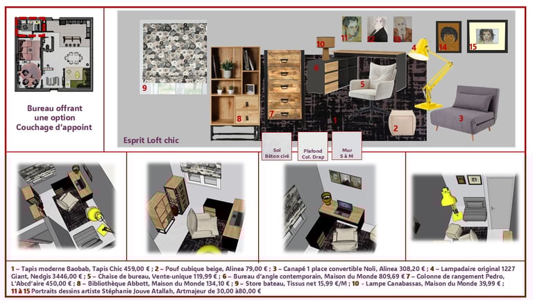 La forme en L de la pièce a été exploitée en logeant dans sa partie la plus étroite une chauffeuse qui en se dépliant devient lit d'appoint pour un ami de passage ou une petite sieste. La décoration est plutôt sobre dans son ensemble et se décline en tons de gris et de beige réhaussés par les touches sombres du mobilier de genre industriel ainsi que la masse noire du tapis qui contraste sur le sol en béton ciré gris clair. Quelques touches de couleur viennent casser l'ambiance studieuse qui pourrait paraître un brin austère mais convient à la réflexion et la concentration. On évitera de trop charger les murs par des étagères encombrantes et inutiles par exemple, afin de ne pas réduire l'espace et le rendre étouffant. En laissant suffisamment de surface libre et neutre sur les murs on crée du calme. Seuls quelques tableaux offrent un peu de distraction avec légèreté. Le lampadaire qui est une reproduction géante d'une légendaire lampe de bureau choisi en jaune vif donne une petite note d'humour et sa conception orientable et métallique renforce l'inspiration industrielle.